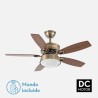 Ventilador DC de la serie BRAW de color CUERO con 5 aspas reversibles color NOGAL/ROBLE. Realizado de metal, MDF y tulipa de cristal. Tiene una medida de 46/56,2x106,7x106,7 centímetros. Tecnología LED integrada con una potencia de 30W, con COLOR DE LUZ SELECCIONABLE EN 3 TEMPERATURAS (3000-4000-6000K) y 2850 lúmenes. Contiene control remoto con 6 velocidades diferentes, memoria de color, modo de verano/invierno y temporizador de 1 hasta 8 horas. Incluye dos tijas de 15 y 25 centímetros. Modelo disponible en los colores blanco-blanco/haya, cuero-roble/nogal y níquel-plata/haya, hasta agotar existencias.