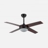 Ventilador DC serie CIRO de color CUERO con 4 aspas color NOGAL. Realizado de metal, MDF y cristal. Tiene una medida de 35/45x116,8x116,8 centímetros. Posee 2 portalámparas E27 (bombillas no incluidas). Contiene control remoto con 6 velocidades diferentes, modo de verano/invierno y temporizador de 1 hasta 8 horas. Incluye dos tijas de 15 y 25 centímetros. Modelo también disponible en color Blanco-Blanco/Haya, Marrón rústico-Nogal, Níquel-Haya/Plata y Níquel-Wengué/Haya.